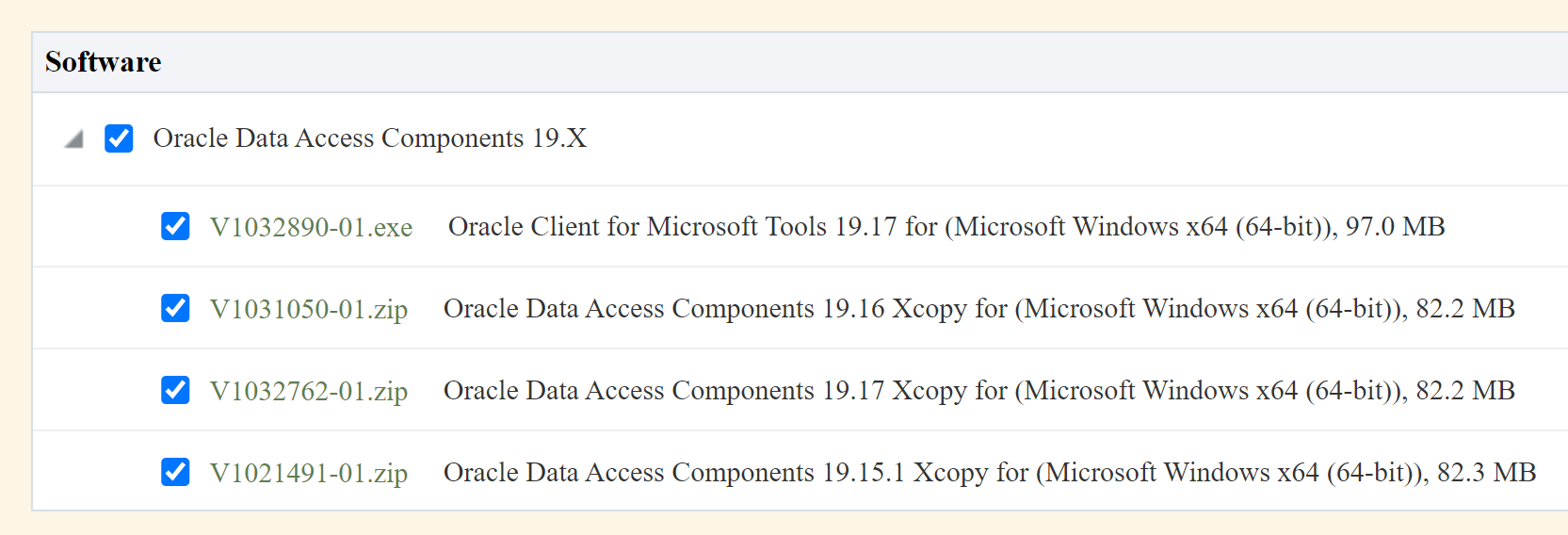 - Download the ODAC package (19c x64 was what we used)--Pay attention to the client version the .exe is going to install, you're going to use the corresponding .zip later