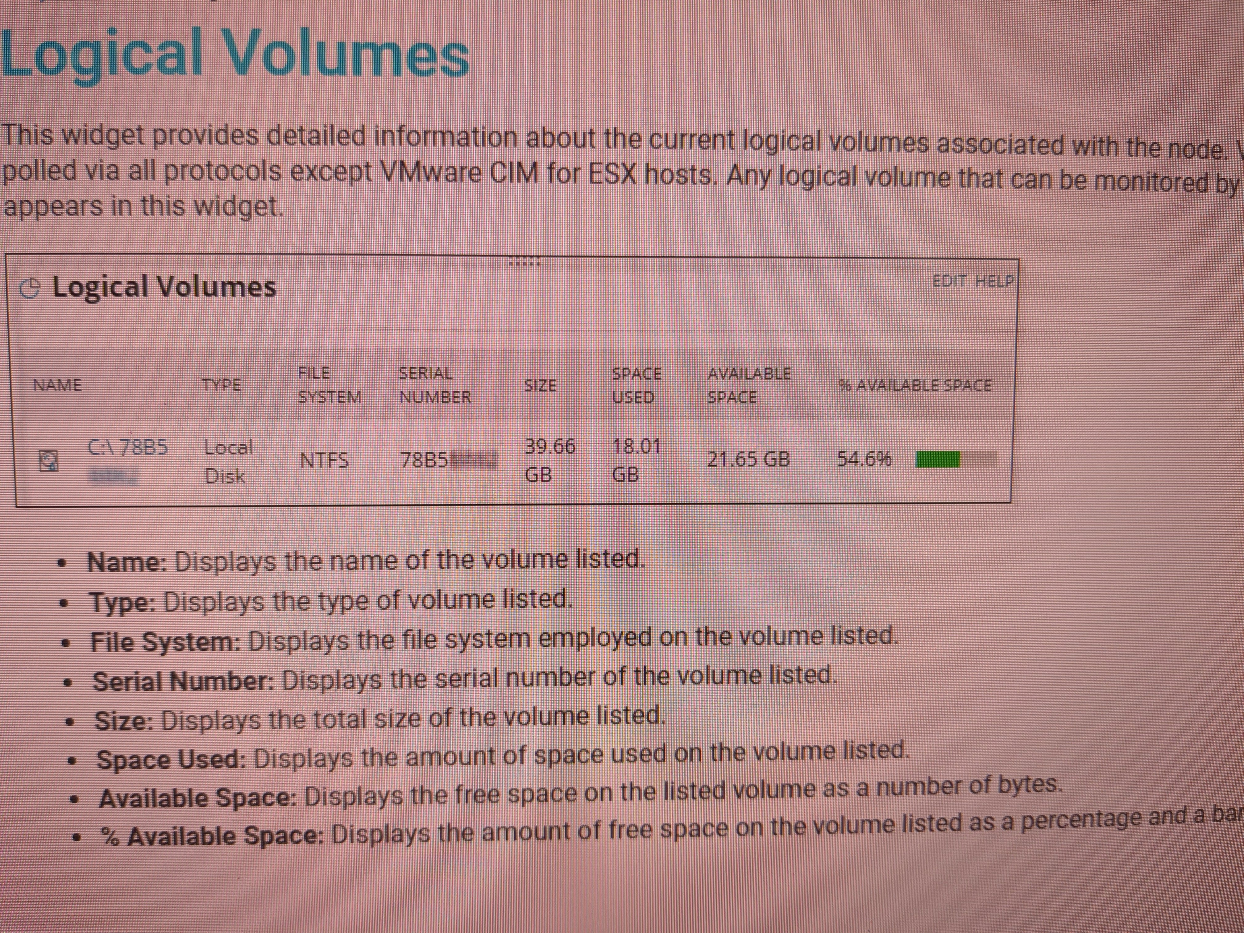 SELECT l.Polling.Node.Caption as [Node Name], l.DeviceID as [Disk Name] , v.Type as [Type], l.FileSystem as [File System], l.SerialNumber as [Serial Number], ROUND((1.0 * l.SizeB/1024/1024/1024),2) AS [Size (GB)], ROUND((1.0 * (l.SizeB - l.SpaceAvailableB)/1024/1024/1024),2) AS [Space Used (GB)], ROUND((1.0 * l.SpaceAvailableB/1024/1024/1024),2) AS [Available Space (GB)], ROUND((100.0 * l.SpaceAvailableB / l.SizeB),1) AS [% Available Space], l.Polling.Node.DetailsUrl as [_LinkFor_Node Name], v.DetailsUrl as [_LinkFor_Disk Name]FROM Orion.AssetInventory.LogicalDrive l LEFT JOIN Orion.Volumes v ON l.NodeID = v.NodeID AND v.VolumeDescription LIKE ToString(l.DeviceID + '%')AND v.VolumeSize = SizeBWHERE l.FileSystem='NTFS'ORDER BY l.Polling.Node.Caption, l.DeviceID