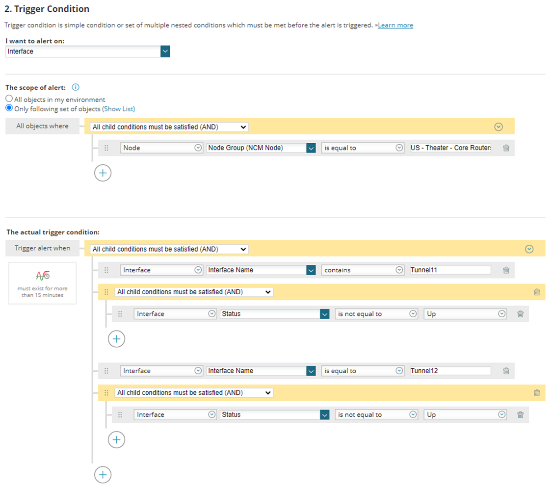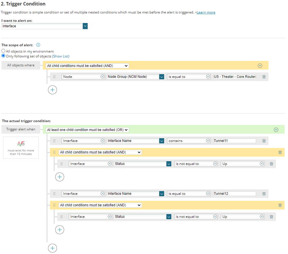 WHERE ( ( ( E0.[Node].[NodeProperties].[NodeGroup] = 'Branch Routers' ) ) AND ( ( E0.[InterfaceName] LIKE '%Tunnel11%' ) AND ( ( E0.[Status] != '1' ) ) OR ( E0.[InterfaceName] = 'Tunnel12' ) AND ( ( E0.[Status] != '1' ) ) ) )
