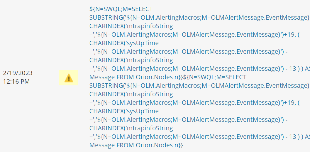 ${N=SWQL;M=SELECT SUBSTRING('${N=OLM.AlertingMacros;M=OLMAlertMessage.EventMessage}',
