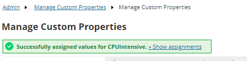 I tried creating a new custom property and then clicking "Save and assign values." The next screen that allows me to select the nodes would not open properly and I saw two "An error has occurred " notifications. The details of each were stack traces: