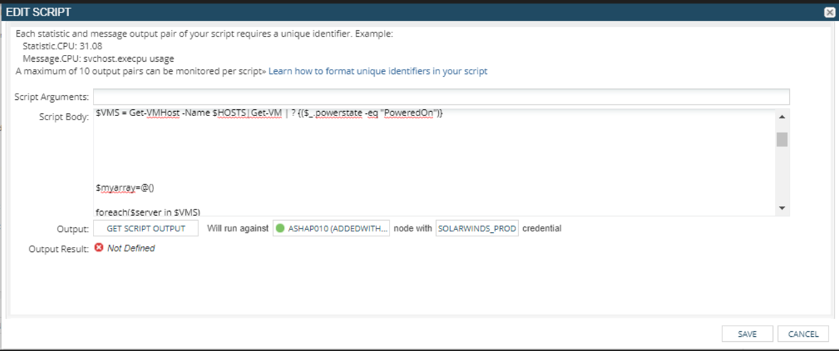 I am new to SolarWinds SAM module. Our customer looking to run power shell scripts using our SAM module. I read multiple articles how to run PS script but i couldn't get how to update script arguments. We got Power shell script from our Vcenter team to run . using that script we want to login to Domain controllers via VCenter and extract some information. Can some one please help me on this? I feel completely blank in this. Below is the error i am getting.