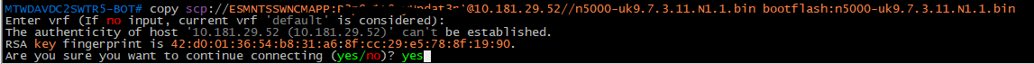 2023-03-15 13:18:19,584 [109] ERROR SolarWinds.NCM.Transfer.DirectTransfer - ErrorMessage: Process could not continue because execution results do not match expected pattern: n5000-uk9.7.3.11.N1.1.bin CommandOutput: