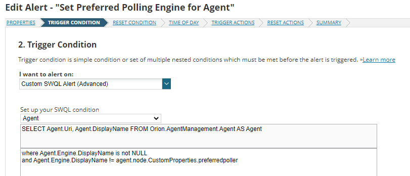 The logic for the alert trigger is some SWQL, and the reset is just when the trigger condition is no longer true.