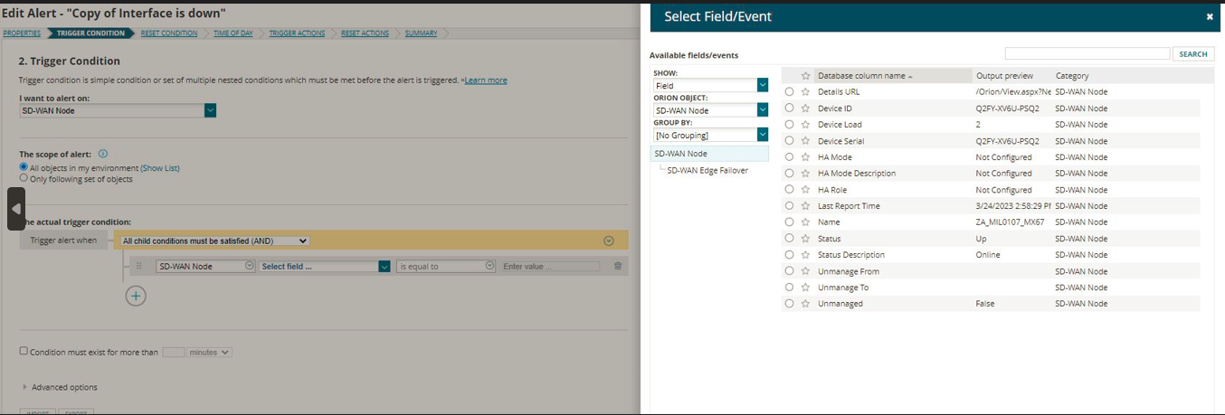 I use the interface down alert, and duplicate it, then I choose I want to alert on SD WAN Node, and then in my trigger condition as showb below, I dont see any interface name vlaue, or even a value for WAN uplinks etc.