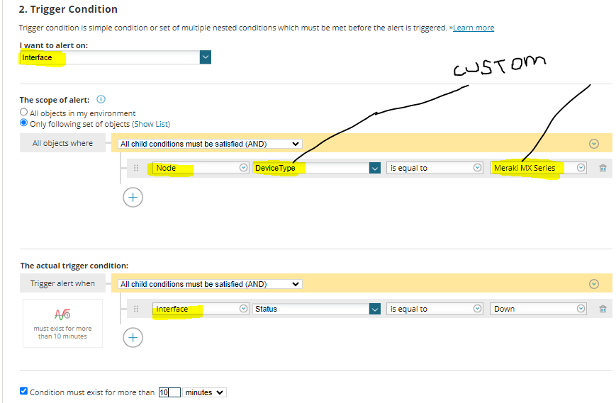I am looking for help with alerts for Meraki MX appliances, cant seem to find the condition that will allow me to alert when WAN 1 or WAN 2 uplinks go down. I also have a custom property for NodeLocation called Stores, and this is where all the Meraki appliances are located.