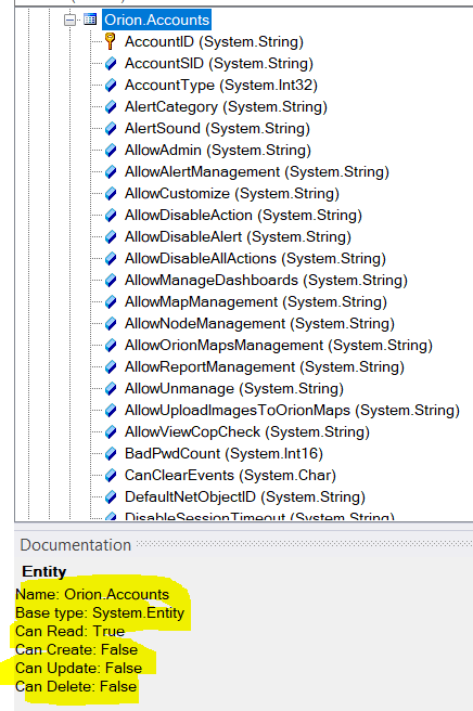 The problem I am seeing is thtat the "Orion.Accounts" table in SWQL Studio is marked as