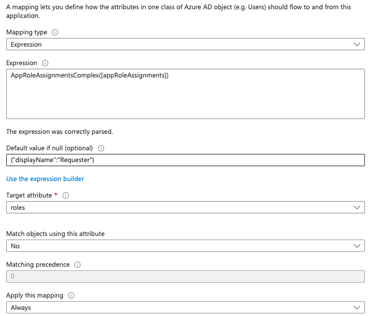 When the mapping was auto-setup, the attribute mapping for the "role" was set to an Expression of AppRoleAssignmentsComplex([appRoleAssignments]) Per the documentation, I set the Default Value if null field to "{"displayName":"Requester"} as well, so now the mapping looks like this: