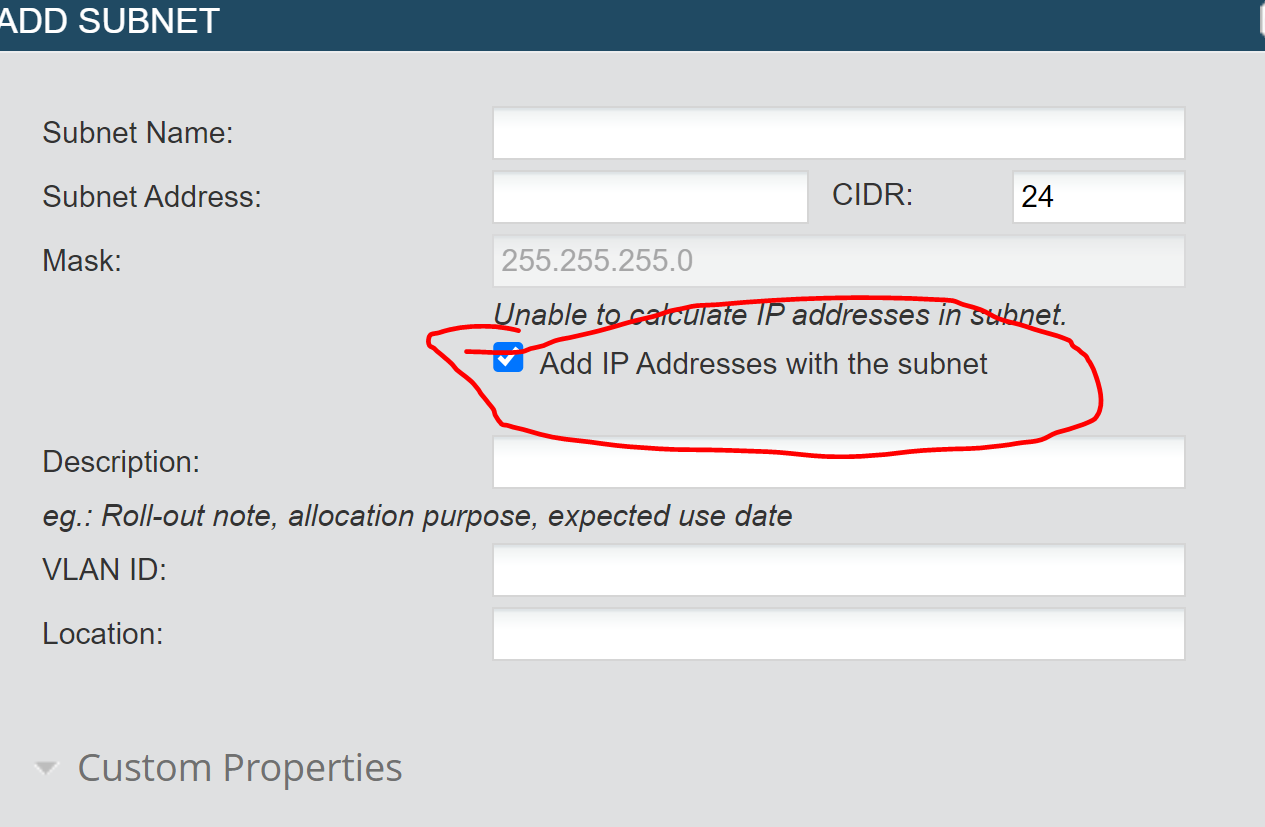 I'm using the SolarWinds API to Create subnets (mysolarwindsurl:17778/.../IPAM.Subnet), but I don't want any IP Addresses.