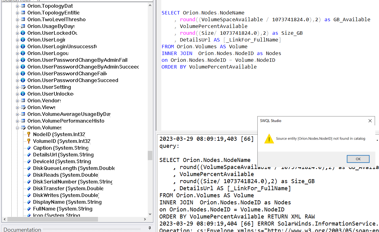 I am trying to create a widget with the Volume size available of my nodes and I want to add the NodeName which is not in Orion.Volumes collection but in Orion.Nodes collection.