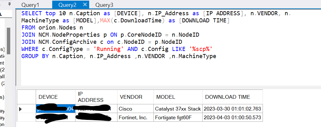 SELECT top 10 n.Caption as [DEVICE], n.IP_Address as [IP ADDRESS], n.VENDOR, n.MachineType as [MODEL],MAX(c.DownloadTime) as [DOWNLOAD TIME]