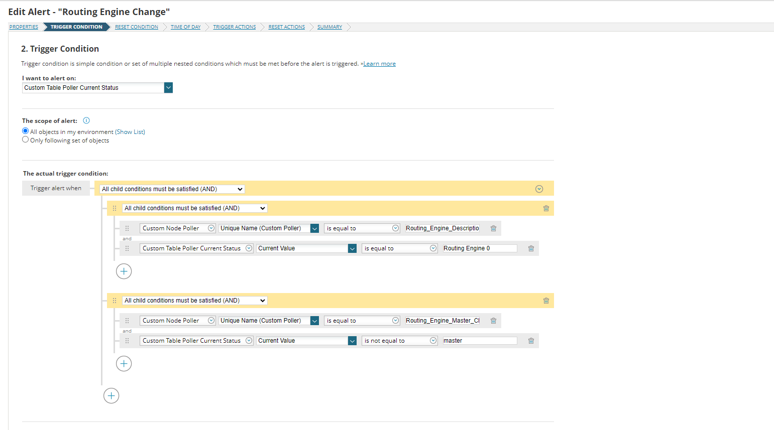 We are trying to alert on a change of the master routing engine in our Juniper routers. We have the following trigger conditions defined, and we know we currently have one Juniper where routing engine 0 is not the master. However the alert does not trigger on that node. Anyone help determine why it does not trigger?