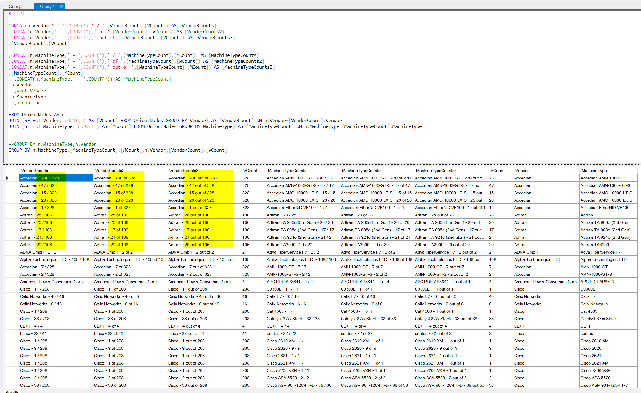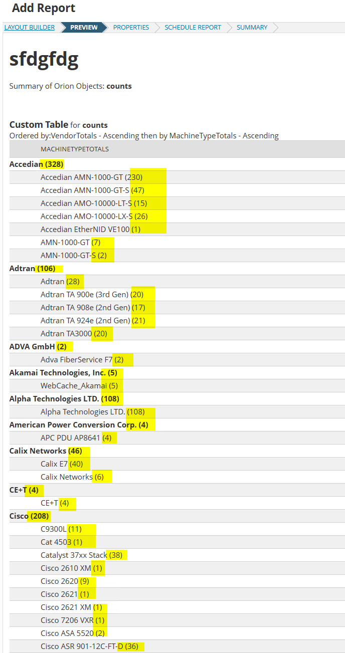 Does Solarwinds have the ability to include totals in the header line for each group in addition to one resource at the top. In practice I'm making a report of servers grouped by type in which each grouping may have a large number of devices. I want to put a 'number of ...' grouping element at the top of the report and number on the same line as the header for that group.
