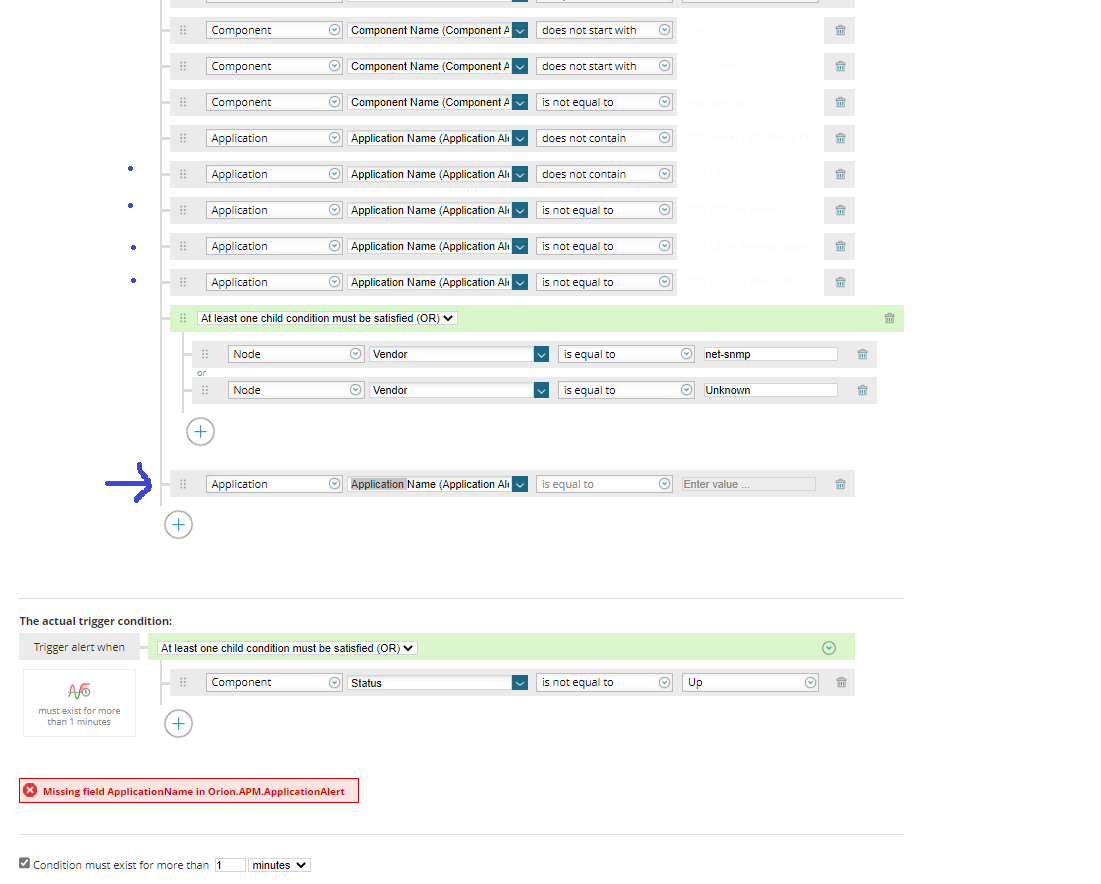 WHERE ( ( ( E0.[Application].[Node].[Status] = @p0*1 ) AND ( E0.[Status] != @p1*1 ) AND ( E0.[Status] != @p2*1 ) AND ( E0.[Status] != @p3*1 ) AND ( E0.[Status] != @p4*1 ) AND ( E0.[Application].[Node].[CustomProperties].[OPS_Targeted_Alert_Node] = @p5*1 ) AND ( E0.[ComponentAlert].[UserNotes] NOT LIKE @p6 ) AND ( E0.[ComponentAlert].[UserNotes] NOT LIKE @p7 ) AND ( E0.[Application].[Node].[CustomProperties].[OPS_Targeted_Non_Crt_Node] = @p8*1 ) AND ( E0.[Application].[ApplicationAlert].[ApplicationName] LIKE @p9 ) AND ( ( E0.[Application].[Node].[Vendor] = @p1*10 ) OR ( E0.[Application].[Node].[Vendor] = @p1*11 ) OR ( E0.[Application].[Node].[Vendor] = @p1*12 ) ) ) AND ( ( E0.[Status] != @p1*13 ) ) )), condition = (AlertConditionDynamic: scope=(