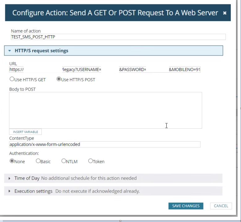 We have tried to create an HTTPS POST to our legacy SMS gateway, and in URL we have posted all necessary details but we received an error in Logs : (405) Method Not found,