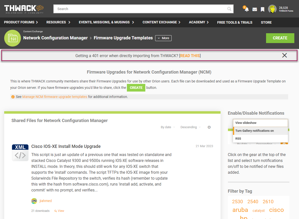 At the company I work for, we use SolarWinds Orion NCM. I am currently attempting to set up the firmware upgrade feature and am having some difficulty with importing firmware upgrade templates from Thwack.