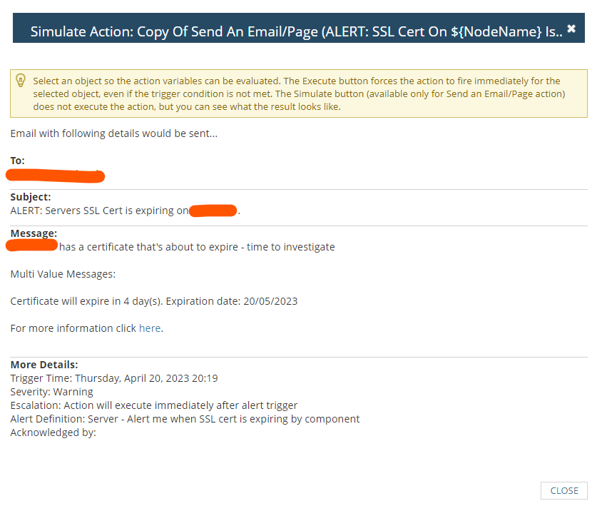 We are using a certificate date component monitor and we want to get the test results through in the email but can't find a way to get the actual test results that shows the expiring cert / item.