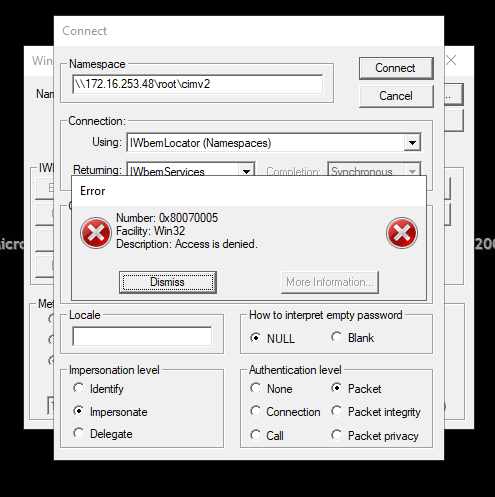 When I log into the server and run wbemtest to the nodes failing, it fails, but it goes through just fine on the one connecting: