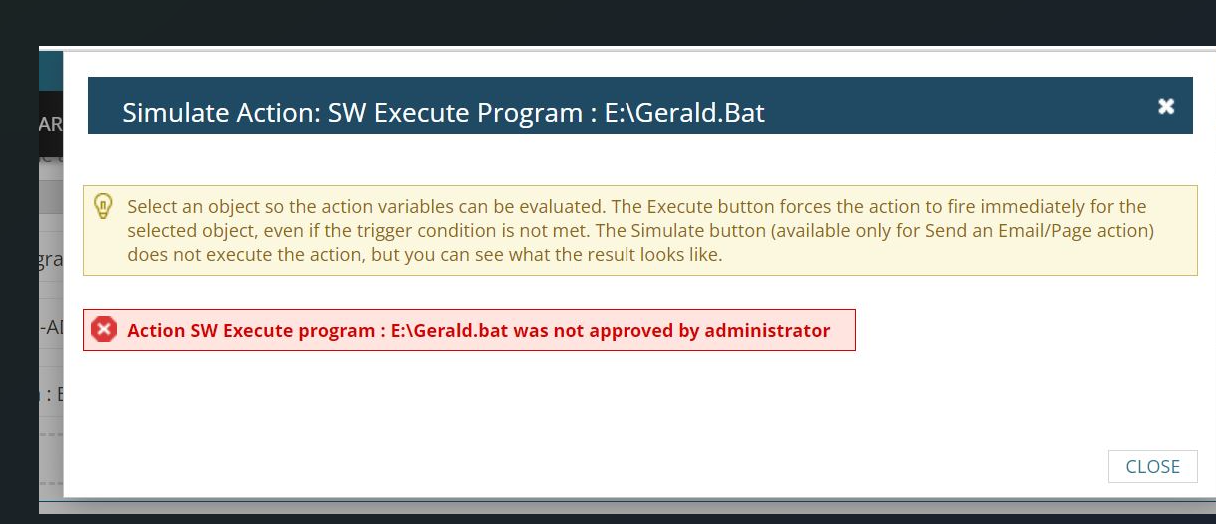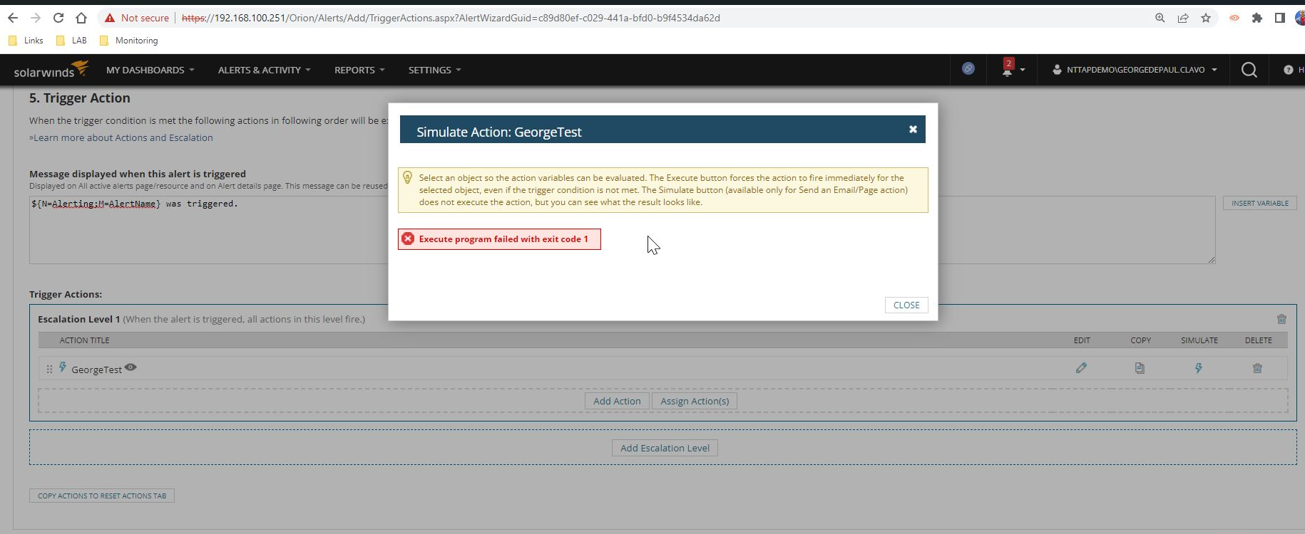 I hope this message finds you well. I am currently exploring the alert triggering action using the "execute program" function. However, when I simulate the process, I encounter an error stating "Execute program failed with exit code 1."