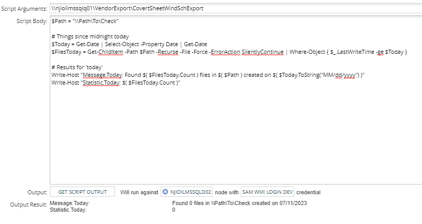 # Results for 'today'Write-Host "Message.Today: Found $( $FilesToday.Count ) files in $( $Path ) created on $( $Today.ToString("MM/dd/yyyy") )"Write-Host "Statistic.Today: $( $FilesToday.Count )"