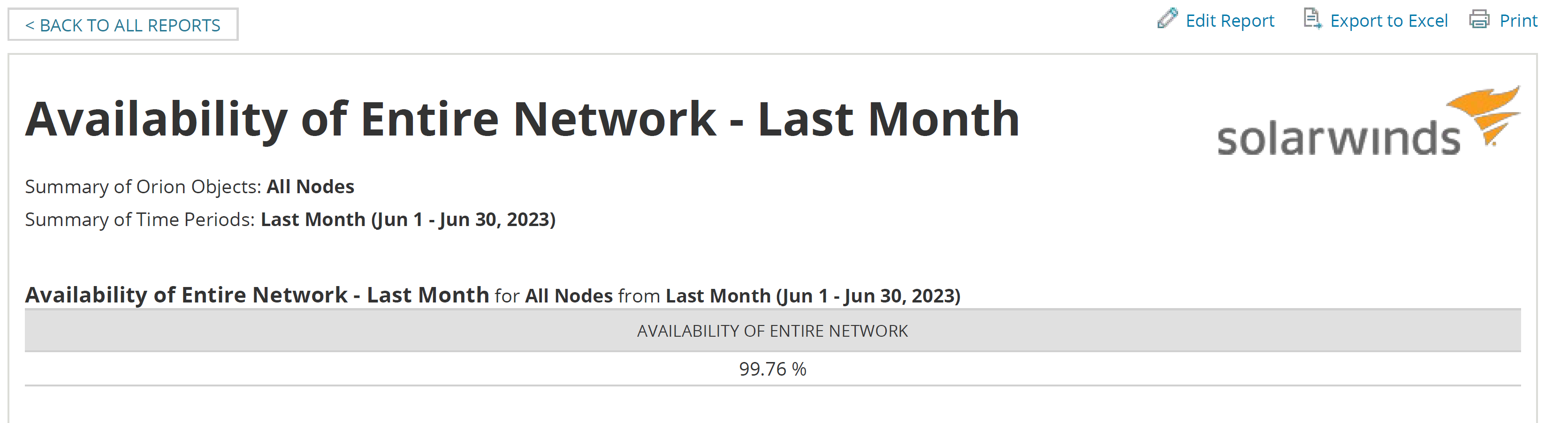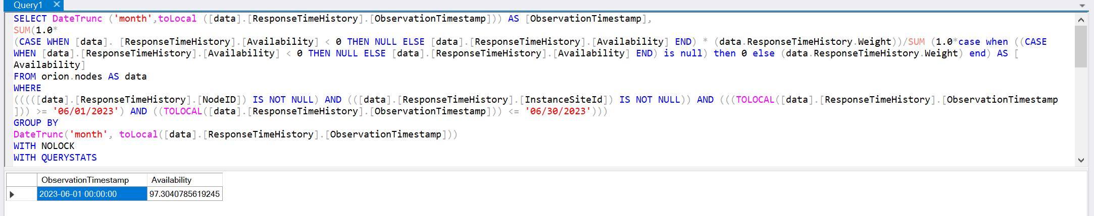 I am attempting to create a SWQL or SQL query that will return the average availability of the entire network (All monitored nodes) for the last month. We currently have a web report that does this but would like to integrate this metric to a Power BI dashboard. However, when running SWQL or SQL against the database, the values returned do not match the web report values. Below is a screenshot of what the web report shows versus what the queries return, there are no filters on the web report. Any help or insight would be appreciated, the query was retrieved using the Hubble trace option.