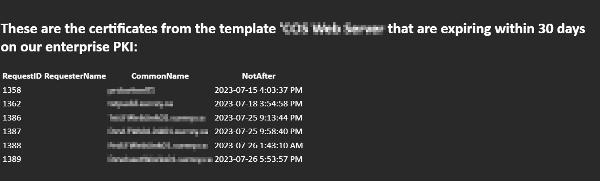 $HTMLReport = $Report | ConvertTo-Html -Title "Expiring Certificates Report" -PreContent "These are the certificates from the template that are expiring within $Threshold days on our enterprise PKI:"