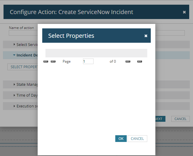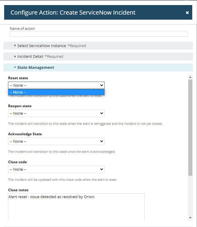 When trying to add the Trigger Action of 'Create ServiceNow Incident' however, under Incident Detail there are no available properties to select. Furthermore, under State Management there no options to select under Reset State, Reopen State, Acknowledge State, or Close code. The only option given is "None". Please see the pictures below for reference.
