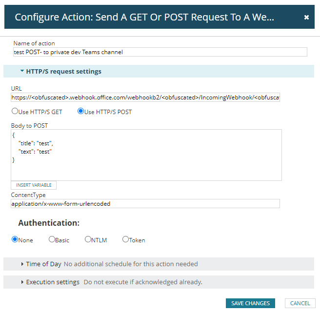 Failed to execute an HTTP request. Method: POST, Url: https://.webhook.office.com/webhookb2/, Body: { "title": "test", "text": "test" })