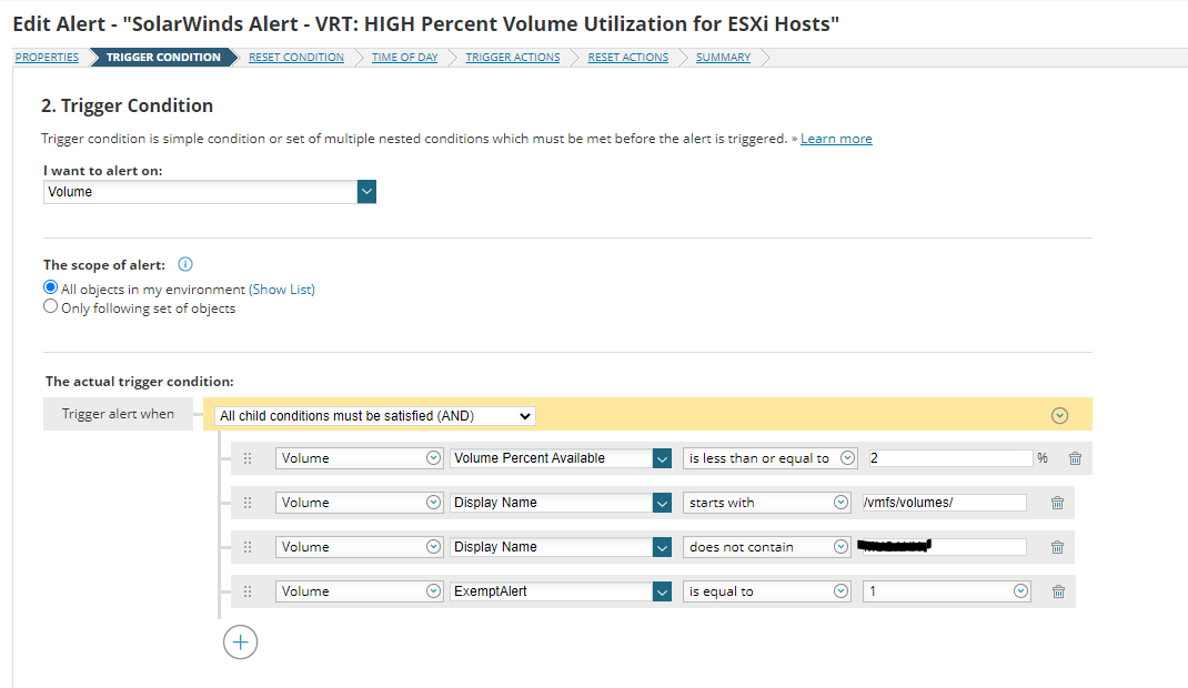 I'm using the alert manager to generate an alert for a volume object and I am trying to limit the alert to triggering on volumes that are very specific to the type mounted on an ESXi host. The same single volume can be mounted on multiple ESXi hosts and I do not want the alert to trigger for each host that contains it. If the condition is true for one, its true for all so I only want one alert. However, the alert trigger pictured geneartes the same alert across multilpe nodes even though there is no node predicate. Why? Perhaps because every volume attached to a node has a unque ID relative to the node, hence multiple objects with the same display name? What must I do to trigger this alert on just one instance of that volume object? Is custom SWQL (Distinct) my best option here or maybe I need to pick one VolumeID? That's probably not a good idea since it could go away on on that particular node.