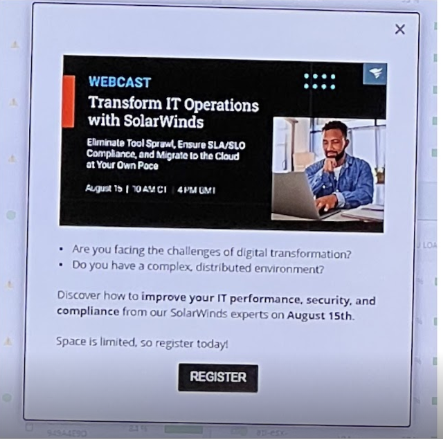 We have Solarwinds Platform v 2023.2.1 and maintain a dashboard that is displayed for everyone on the team to see. Today we noticed a popup advertisement that renders the dashboard unusable. We've not seen this before. Does anyone know how to disable this sort of popup activity completely? I get it that it's nice to "broadcast" to your user base -- putting security issues aside, this sort of behavior is not desired from any vended product. I've attached a few photos from folks nearest the dashboard as it's displayed. Thanks for any insight or at least "yep, we've seen that too."
