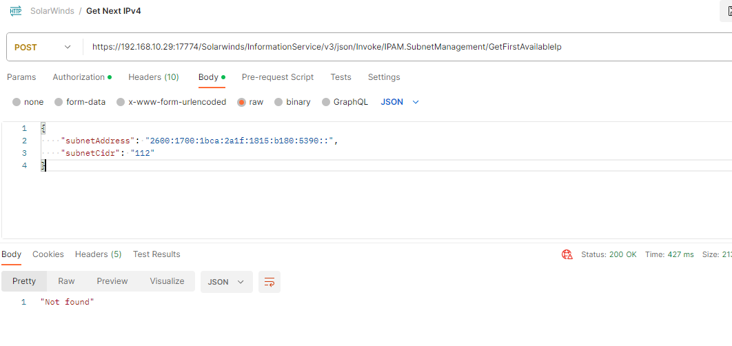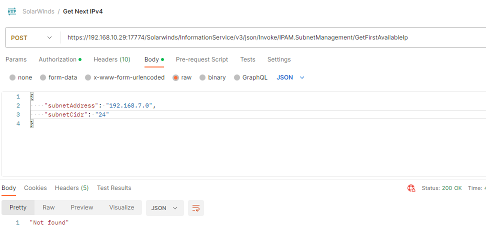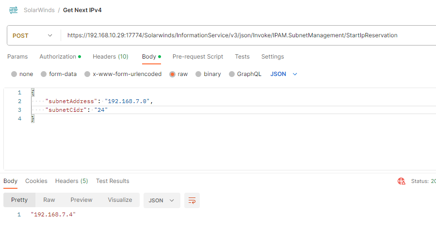 I'm working on further integrating my application with SolarWinds IPAM. I'm looking at the SWQL Studio and see that IPAM.SubnetManagement has verbs for "GetFirstAvailableIp" and "GetFirstAvailableIpv6". I'm having issues with both as well as the "StartIpReservation" (mind you I installed the trial so should be on current (IPAM: 2023.3.0 )).