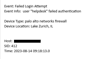 I have a rule that alerts me when we have a failed login on our firewall. I would like to have it list the public IP address that attempted to login. Palo Alto keeps this information, so I should be able to find a rule ID for this, but I cant seem to find it anywhere. Any help would be appreciated! Host: is my devices IP address, but I would like to add a field for the public IP of the attempt.
