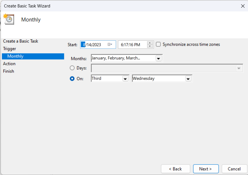 I'm hoping to schedule a job to run on the third Wednesday of each month. We don't want it on a certain date because we don't want it run on a weekend. I can't see a way to do this under Basic schedule and the advanced schedule doesn't take the Cron syntax for it, 00 01 * * 4#3.