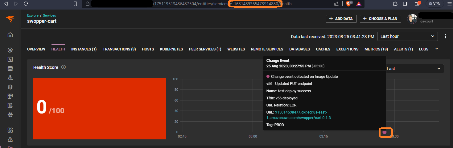 Once your entity-associated Change Events are received by the SWO Platform, they should appear as data points on the corresponding entity Health Score timeseries chart.