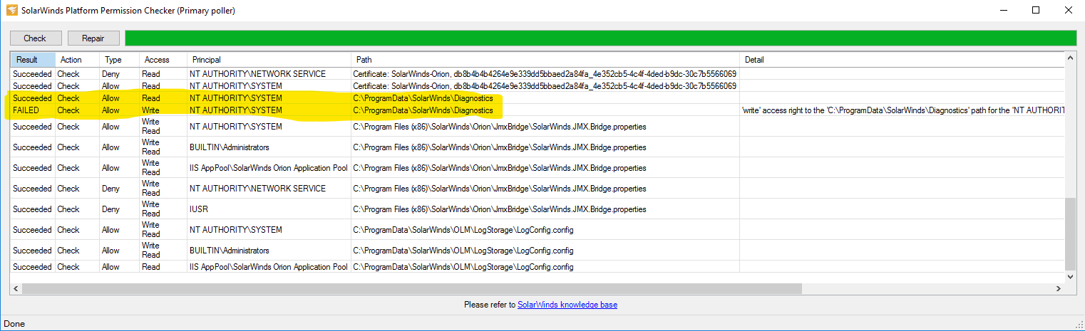 This looks to have bee nset up incorrectly as only one or the other check will every pass and if you run the fix it swaps between Read or Write. It looks to me as though it should be set up as Read / Write like the ones below it. Might explain why it takes ages to run when you kick of the configuration tool.