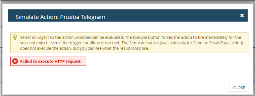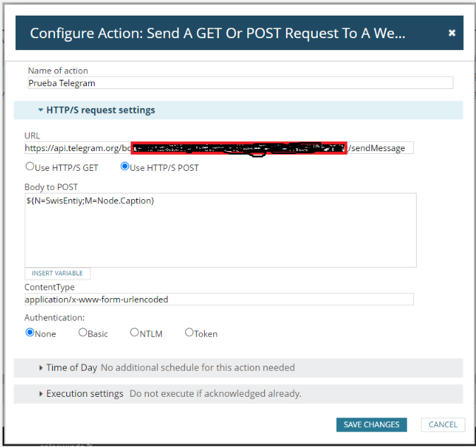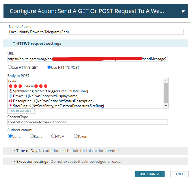 I am trying to integrate Telegram with Solarwinds alerts and I am not being able to, when I simulate the action I get that failed to execute HTTP request.