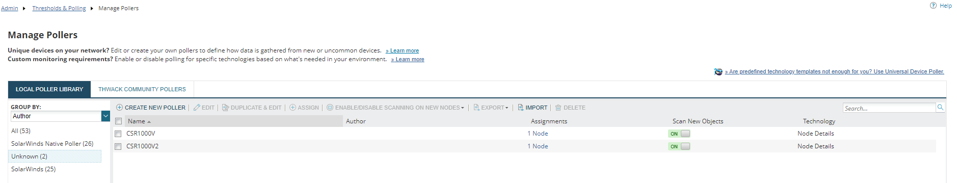 We use a custom pollers so the Node Details "MachineType" pulls the specific model name/number of the node. After I add a node to Solarwinds with Ansible (using this ansible collection), I want to assign the custom poller, (for example CSR1000V as shown below) to the node so the Machine type pulls the specific module name in the machine type. I have already brought this issue up on in the collections github and looking for additional help to figure this out.