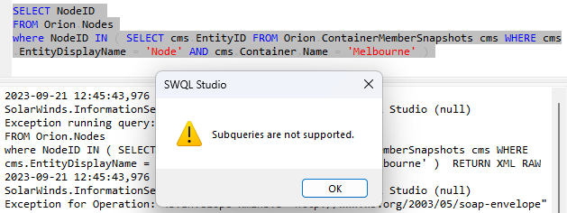 I have seen the EOC thread already https://thwack.solarwinds.com/product-forums/the-orion-platform/f/orion-sdk/97024/subqueries-are-not-supported-running-queries-in-eoc and posted in there, but we were seeing this same problem in Orion Platform.