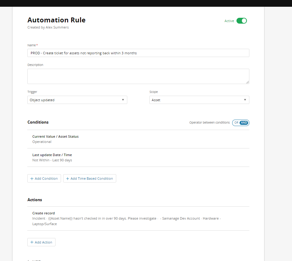 The critial piece I'm stuck on is the Trigger. Since the asset isn't created or updated, which is the main point of this automation, it doesn't ever trigger. I tried leaving it on trigger "Object Updated" but that again defeats the point of this automation rule.