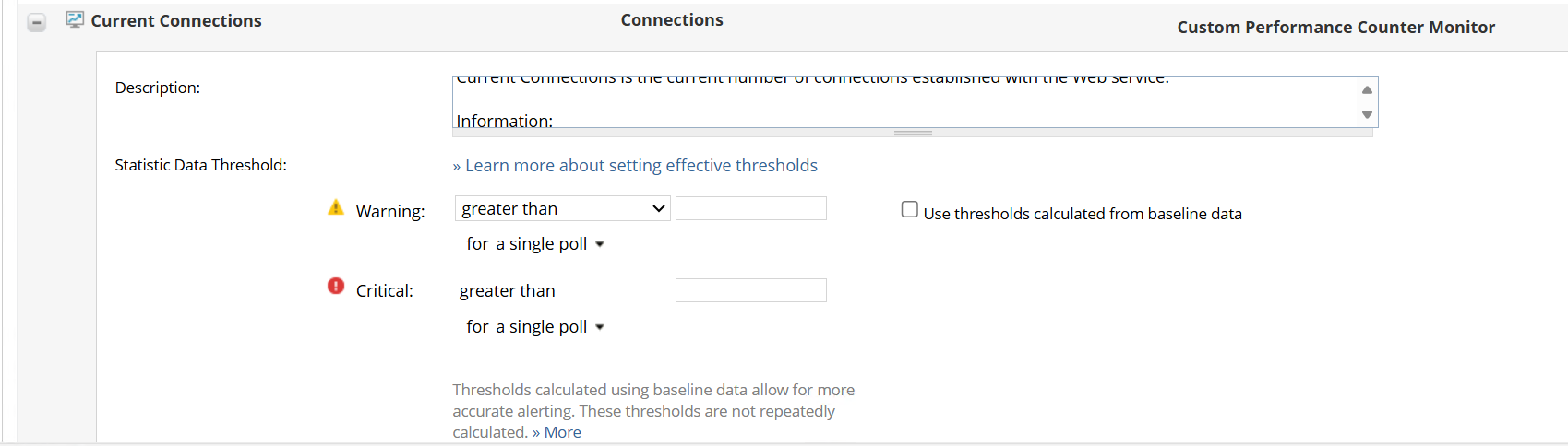 Hi, I would like to receive an email notification when the number of 'Current Connections' to a website goes above 100, I am using the AppInsignt for IIS Application monitor to monitor the web server. Do I need to add some 'statistic data threshold' to the app monitor and how would I configure the alert?