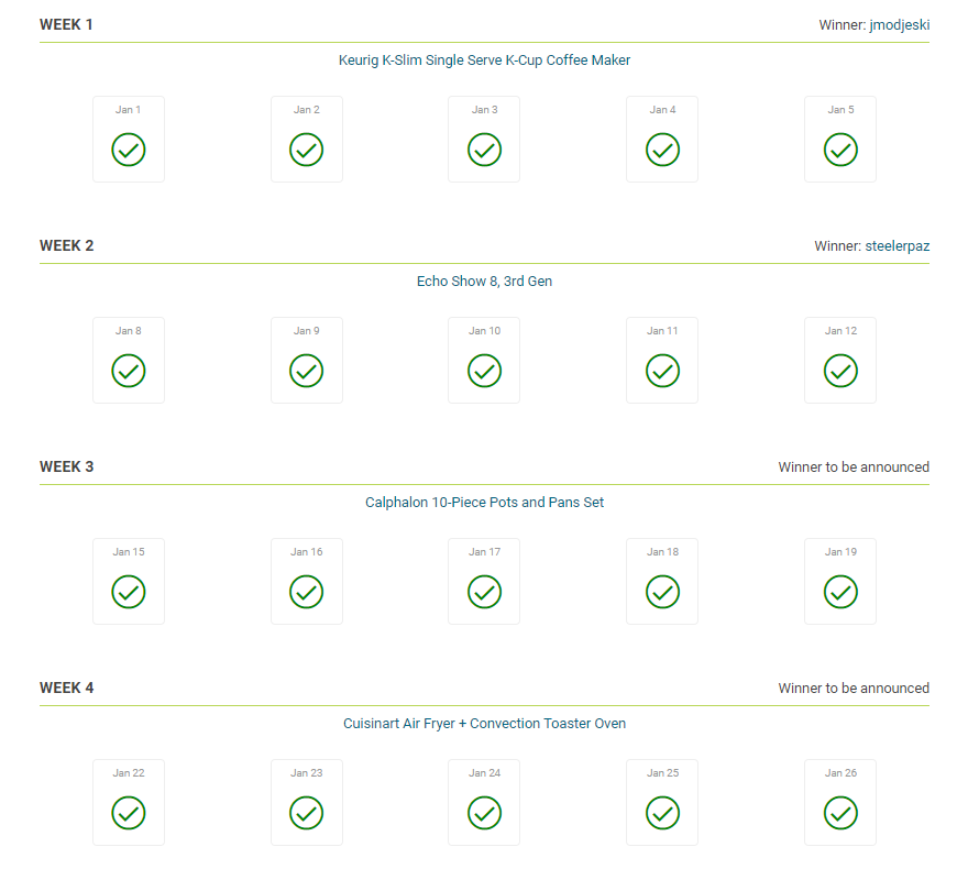A new question will open every day (Monday - Friday) starting on January 1, 2024. Once a question has opened, it will remain open until January 28, 2024 at 11:59 p.m. CT.