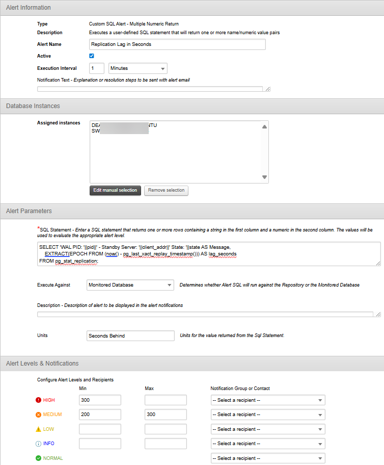 dpa_postgres_replication_lag.sqlThe attached script contains three queries for measuring PostgreSQL replication lag:Count of log files not yet sentAmount of data (MB) behindTime lag in secondsDecide which metric best fits your monitoring needs, then use that query in a DPA Custom Multiple Numeric Alert. Example: