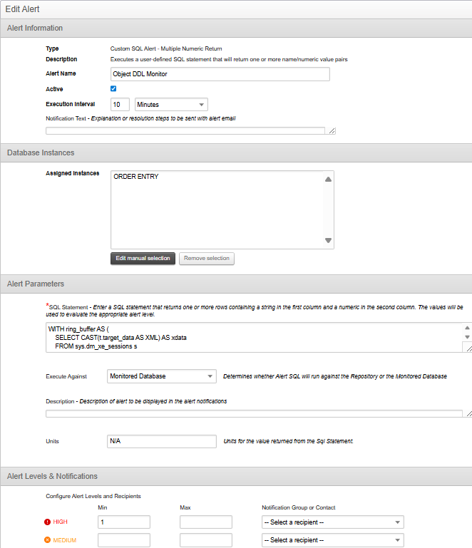 To configure this alert, the first step is to create an Extended Event Session (EES) in the instances being monitored. Example code for doing this is included in the attached script. The alert will return detailed information about object DDL changes including: