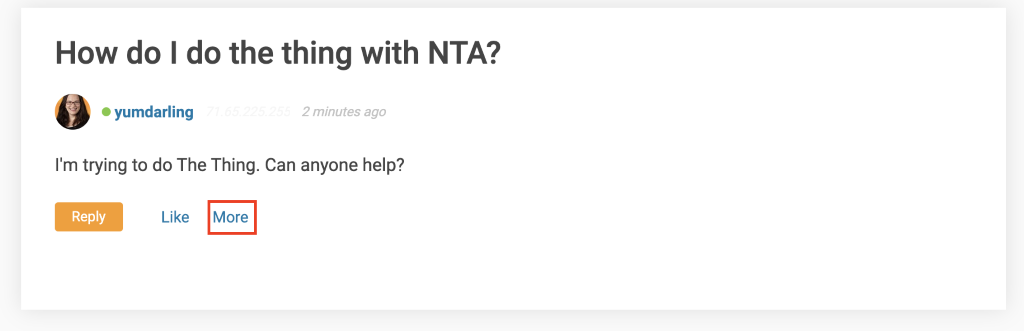 At the bottom of your piece of content, you will find a “more” button Clicking this button will pop up a menu with the option to edit or delete your content. Note: Feature Requests (once voted on) cannot be edited. This is by design to not change the scope of the original request.