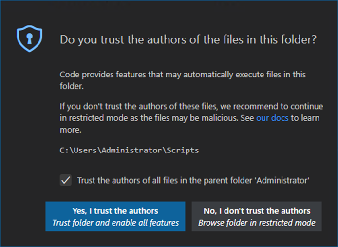 You’ll be prompted to trust the authors in the parent folder as well. Since this is in your own user profile, you can select “Trust the authors.”