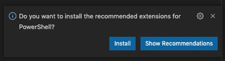 Since this is the first “PS1” file detected for this install, VS Code prompts if you’d like to install the recommended extensions. You can either show the recommendations and install them as you wish or just take the defaults. This autodetection of file extensions works for most common file types and VS Code will suggest the required extensions for execution.