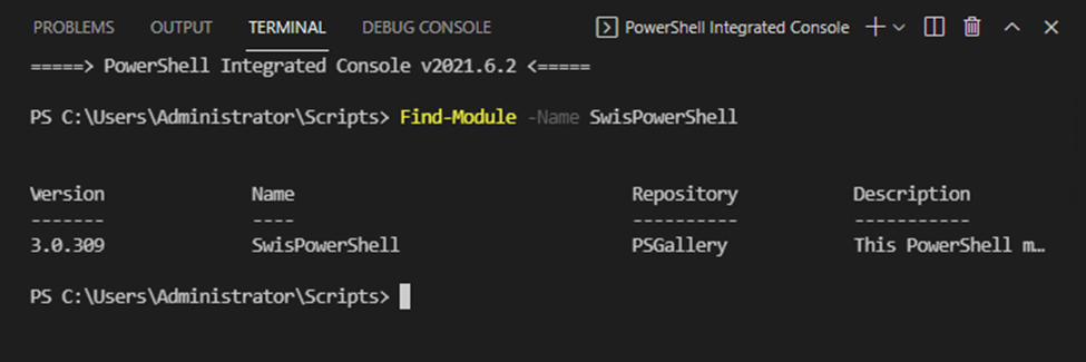 In the lower half of the screen, click on the “Terminal” tab and enter Find-Module -Name SwisPowerShell and then hit Enter.