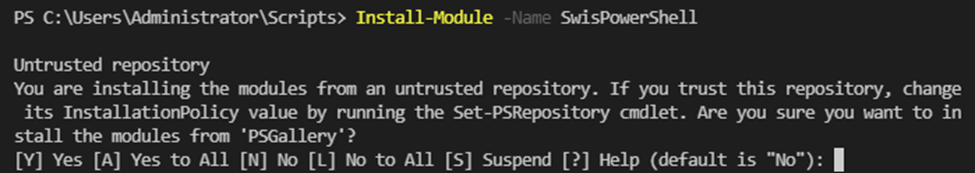 To install the module, in the same space, type Install-Module -Name SwisPowerShell followed by Enter.