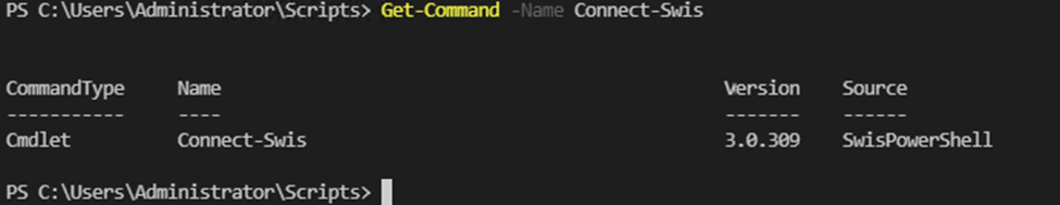 Lastly, we’ll need to confirm that the module’s functions are available, so type Get-Command -Name Connect-Swis and hit Enter.