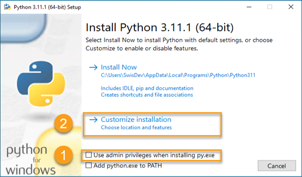 We’ll deselect “Use admin privileges when installing py.exe” and select a customized installation because we only need a subset of what the full Python installer offers.